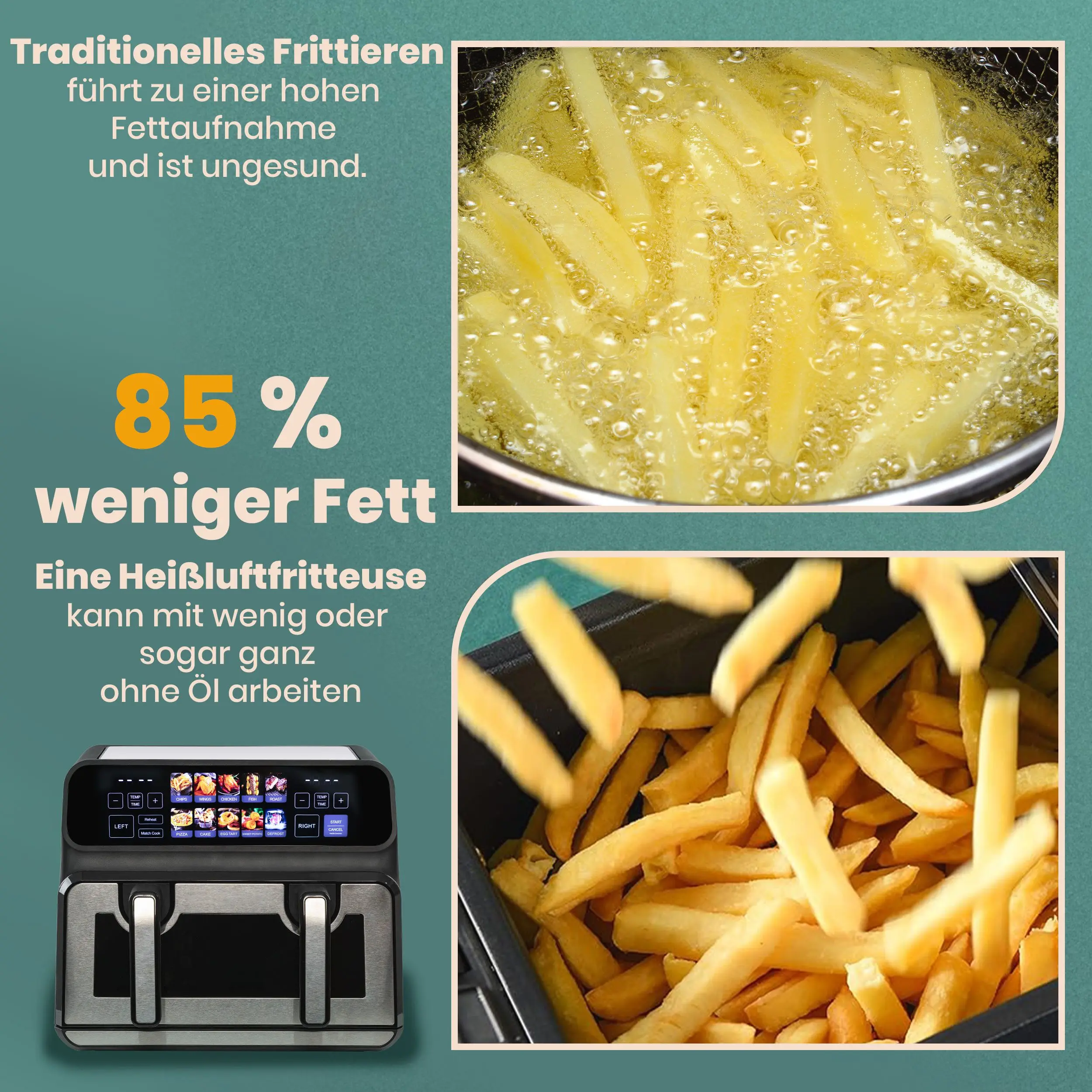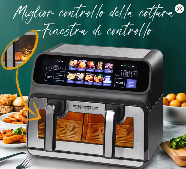 Questa innovativa friggitrice ad aria è dotata di due cestelli da 4,5 litri utilizzabili in modo indipendente, perfetti per cucinare due piatti diversi contemporaneamente senza mescolare i sapori. Per pasti più grandi, è sufficiente rimuovere il divisorio per creare una spaziosa camera di cottura da 9 litri, ideale per porzioni familiari, polli interi o casseruole.